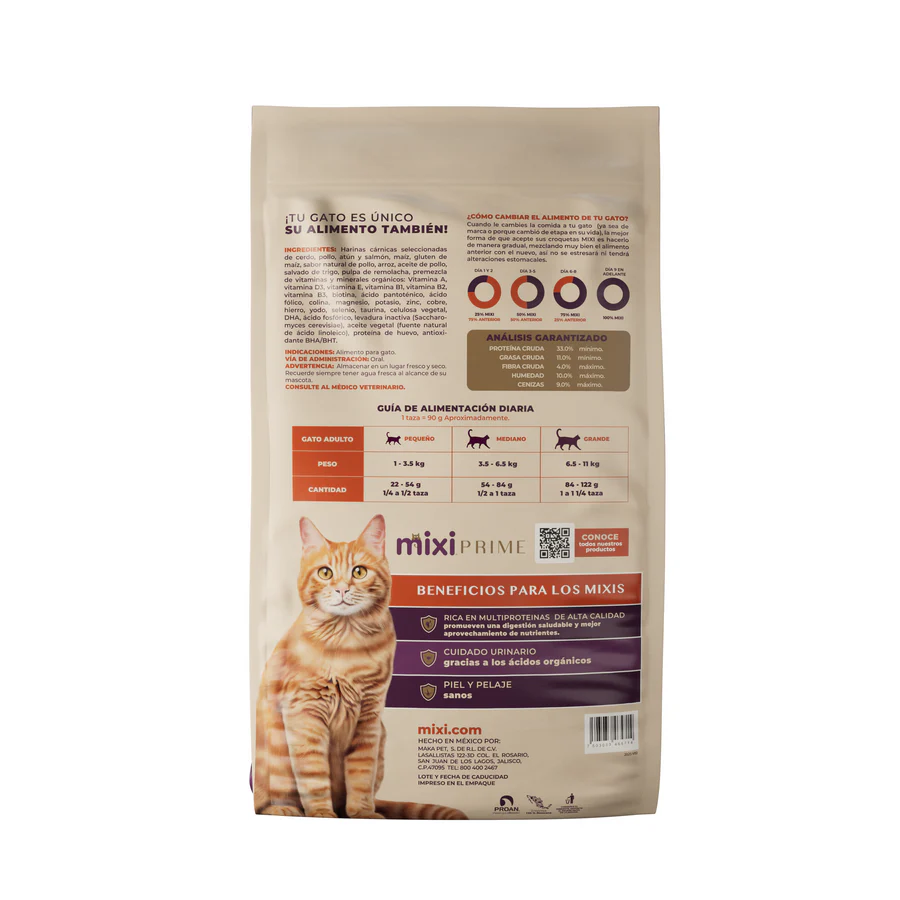 Nutrición premium para gatos que merecen lo mejor. Mixi Prime es un alimento multiprotéico elaborado con cerdo, pollo, atún y salmón, que aporta un 33% de proteína de alta calidad para mantener su masa muscular y energía diaria.