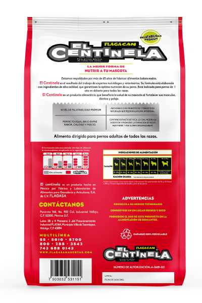 EL CENTINELA es un alimento balanceado para perros adultos de todas las razas con actividad física moderada, a partir de un año de edad en adelante que favorece una mayor salud intestinal, acompañado de prebióticos y vegetales.