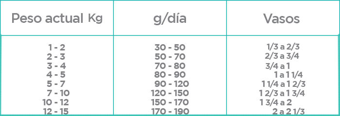1 taza de 8 oz (225 ml) = 83g de NUPEC WEIGHT CONTROL RAZA PEQUEÑA